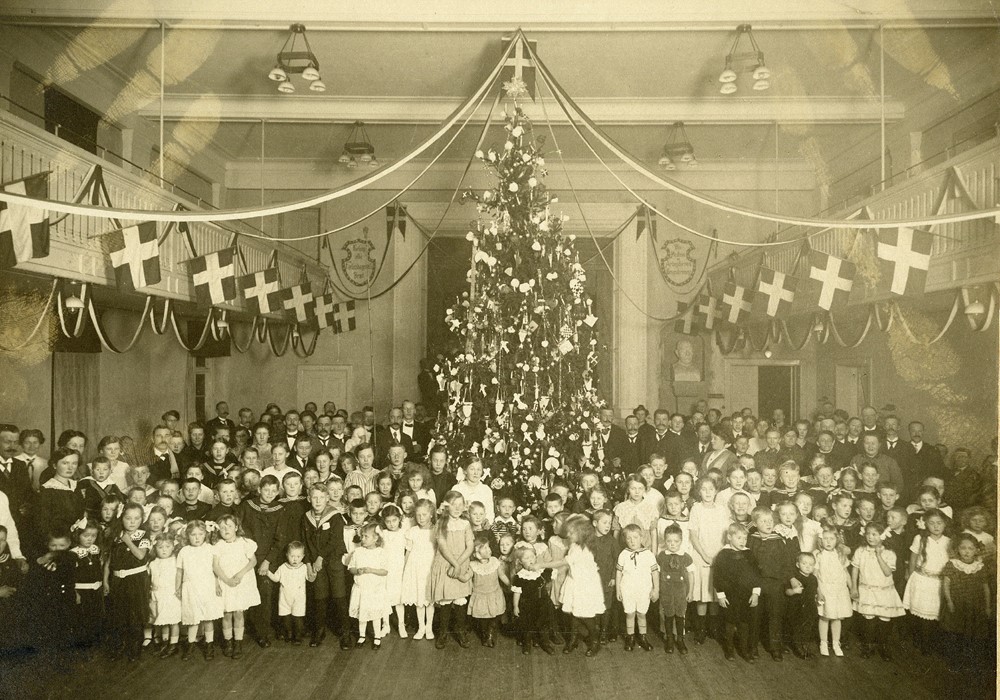 På billedet er vi med til Murernes Fagforenings juletræsfest i Arbejdernes Forsamlingsbygning på Nørrebrogade 5. Børnene er placeret foran træet og bagved står deres forældre og andre voksne fra foreningen. En fotograf er blev engageret til at forevige begivenheden og fagforeningens medlemmer og deres familier.