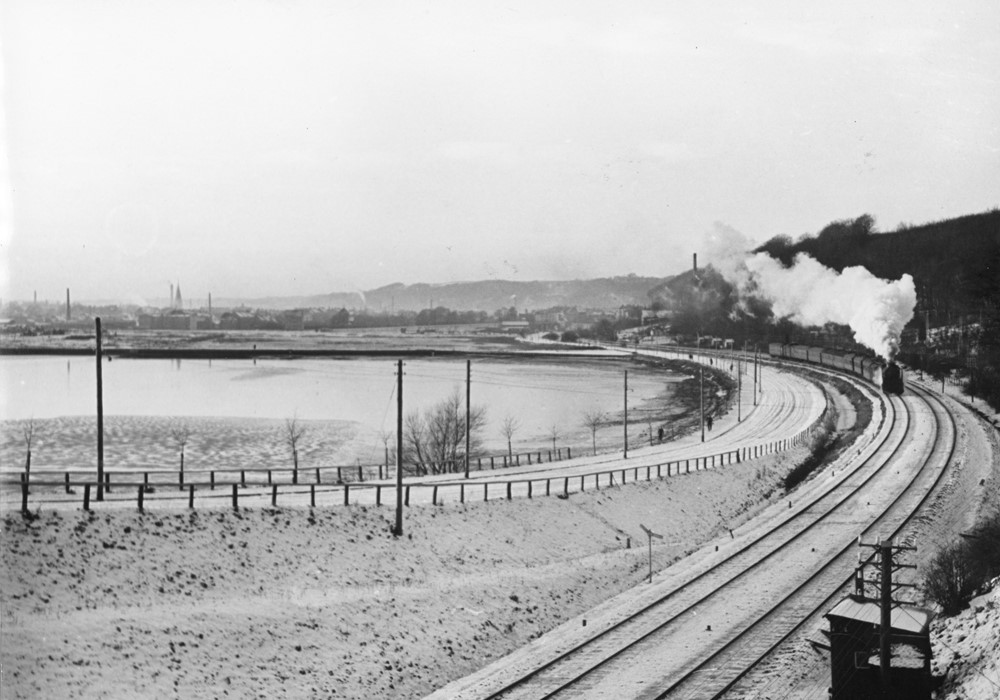 Til månedens billede for februar har vi fundet et foto fra 1945-50. Billedet er taget fra broen ved Helligkildevej med udsigt over jernbanen, Tirsbæk Strandvej, Vejle Fjord og Vejle by.
