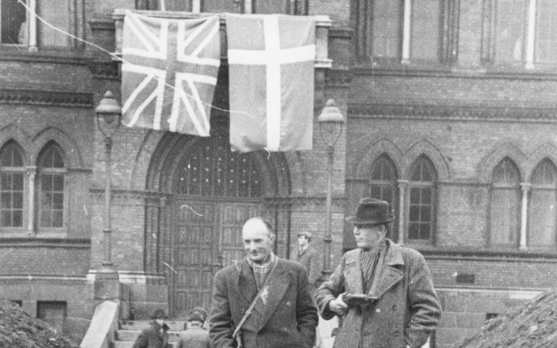 To bevæbnede frihedskæmpere står mellem dækningsgravene på Rådhustorvet den 5. maj 1945. Bag dem ses den tilpassede udgave af det britiske flag, Union Jack. Foto: Oskar Jensen. Vejle Stadsarkiv.