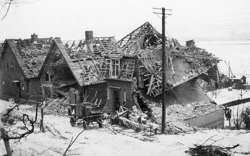 De ødelagte huse ved Skovvang 2-6 i Vejle efter bombenedslag i Nørreskoven 26 februar 1942. Fotograf: Marie Hansen. Foto: Vejle Stadsarkiv.