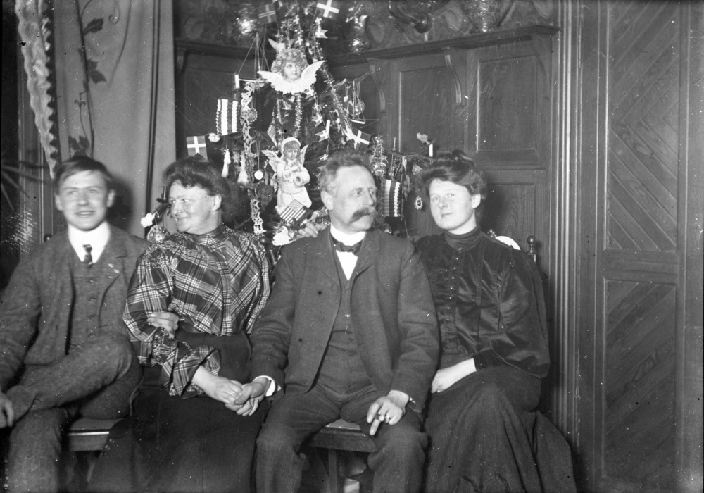 Direktør ved Vejle Dampvæveri Jacob Bundegaard, hustru Wilhelmina med datteren Erna Flach-Bundegaard og sønnen Ejnar Flach-Bundegaard, julen 1905. Familien boede i Skyttehusgade 34, 2. sal i Vejle.