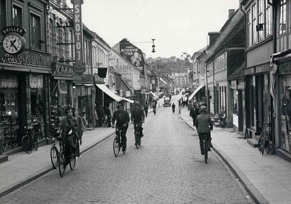 Reklameskiltene fyldte godt i gadebilledet i 1930’ernes Vejle, og dengang var Søndergade også stærkt befærdet af cyklister. Bemærk den store gavlreklame for Medova The, der havde sloganet: ”Er De udkørt klokken tre, drik Medova The!”.