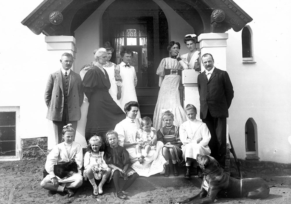 Familien Paulsen poserer her sammen med gæster foran deres hjem, den store hvide villa på Fredericiavej 12 i Mølholm. Året er 1907, og to af familiens ansatte, jomfru Jensen og stuepigen, Helga Jørgensen, er også med på billedet sammen med familiens to hunde.