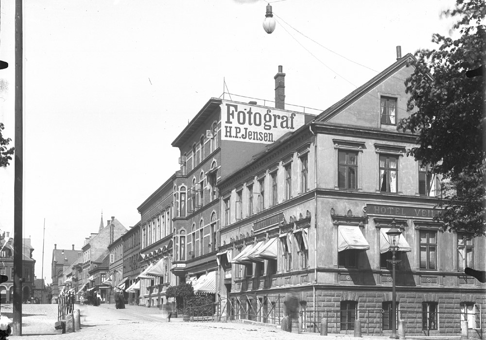 Fotografen Hans Peter Jensen (1855-1924) satte betydelige spor i Vejle både i sin samtid og i eftertiden. Han boede og havde atelier i Kirkegade 23. Her reklamerede han for sig selv på husets gavl, som det kan ses på billedet. Fotografiet er taget fra broen over Mølleåen ved Dæmningen med det gamle Hotel Vejle, Kirkegade 25, i forgrunden.