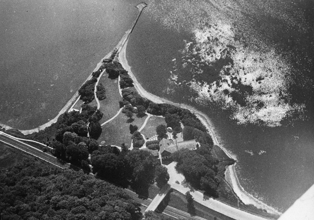 Fjordbådens anlægssted yderst på odden ses øverst i billedet. Fjordbådene bragte vejlenserne fra midtbyen ud til haveanlægget med grønne arealer og skyggende træer. Andre tog en spadseretur ud til en dag ude i det fri.