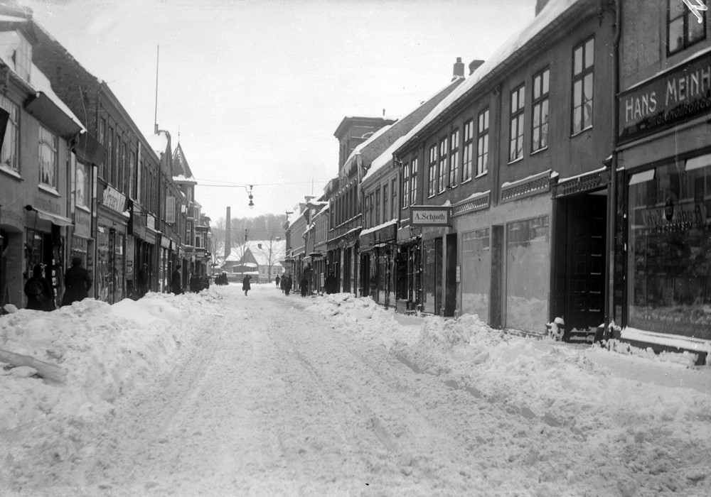 Der var ikke mange folk på tur i Nørregade denne vinterdag i 1930, hvor sneen lå i store dynger og gjorde færdsel i gaden temmelig besværlig.