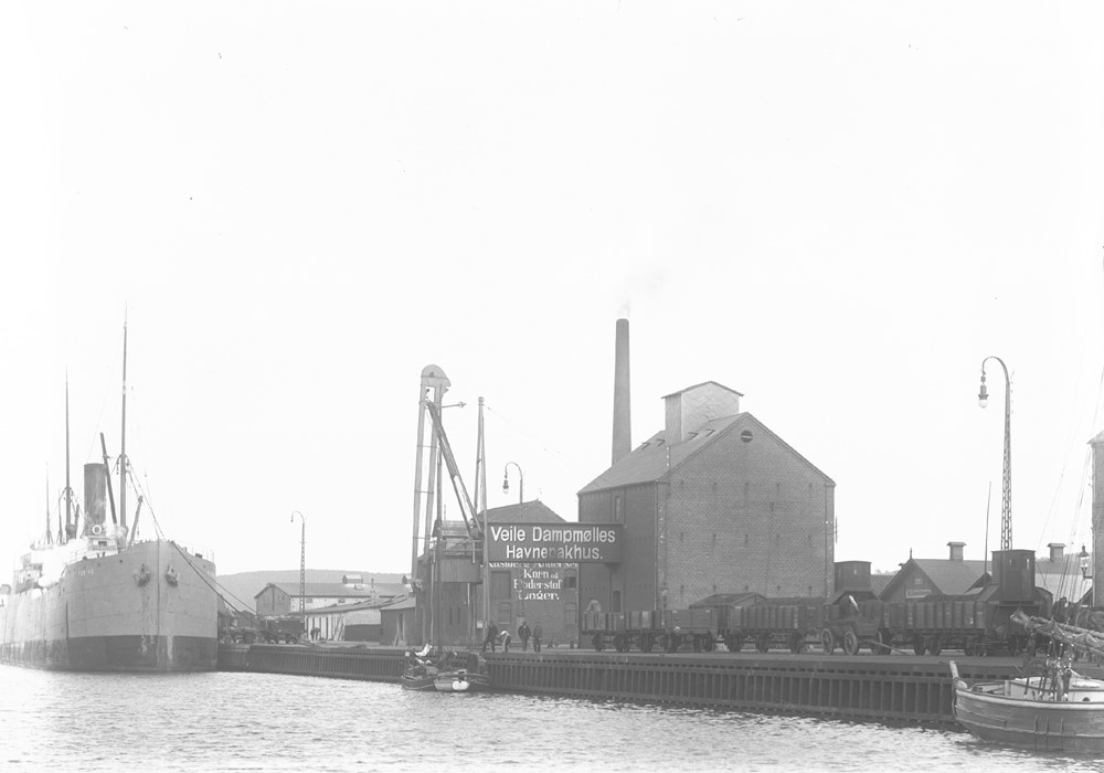 På billedet ser man et skib, som ligger til kaj foran Vejle Dampmølle på Sydkajen i Vejle. Toget holder klar til at fragte møllens produkter videre. Billedet er taget i ca. 1920, og gennem mange år har Vejle Dampmølle været en af de store virksomheder på Vejle Havn. Dampmøllen blev i 1931 overtaget af FDB, der sørgede for at udvide møllen i flere etaper. Blandt andet med et pakhus, der blev opført i 1938/1939.