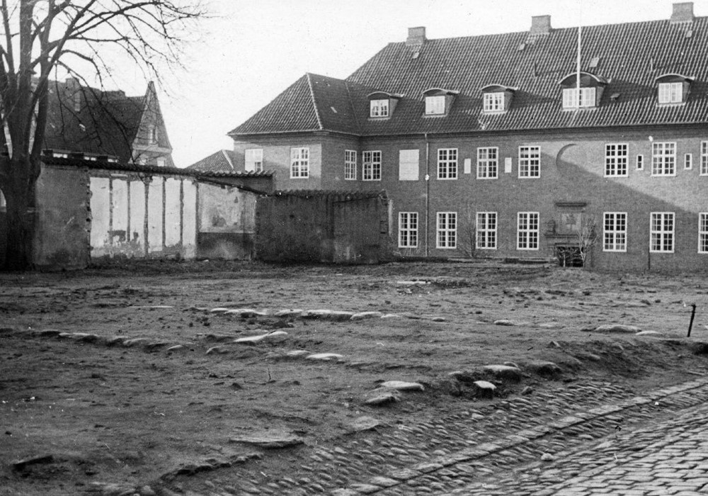 Billedet er taget kort efter opførelsen af Dommergården og er taget fra det, man i dag kender som Klostergade, men dengang hed Skolegade. I forgrunden kan man ane resterne af de grunde, hvorpå de gamle huse lå før nedrivning.