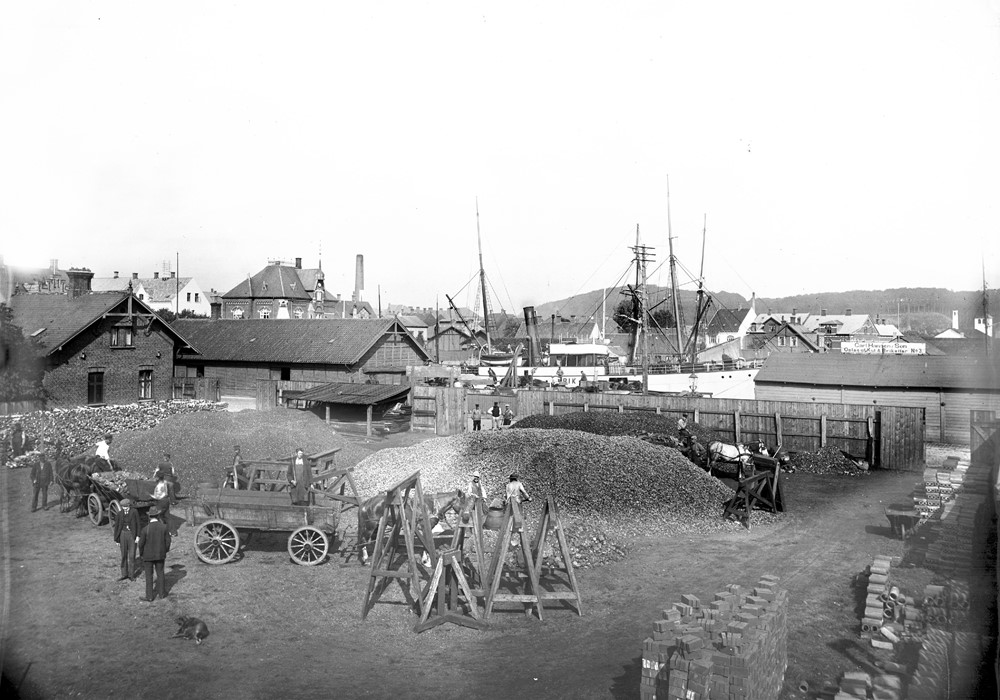 Arbejderne er i sving med det tunge job at læsse brændsel på hestevogne ved kulfirmaet Carl Hansen & Søn, Kulplads 2 på Sydkajen. Havnepladsen ses i baggrunden, hvor skibet ”Erik” ligger foran DFDS’ gamle pakhus.